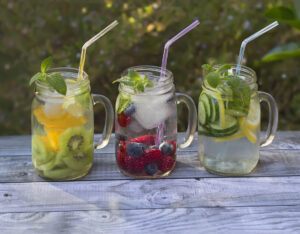 Jars with fruit infused water in summer garden